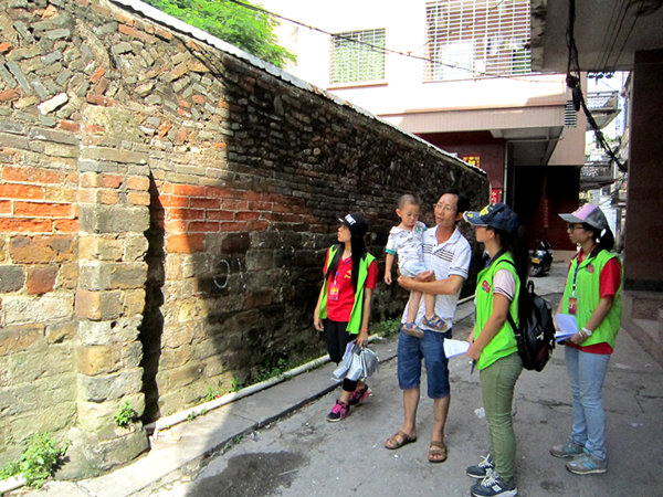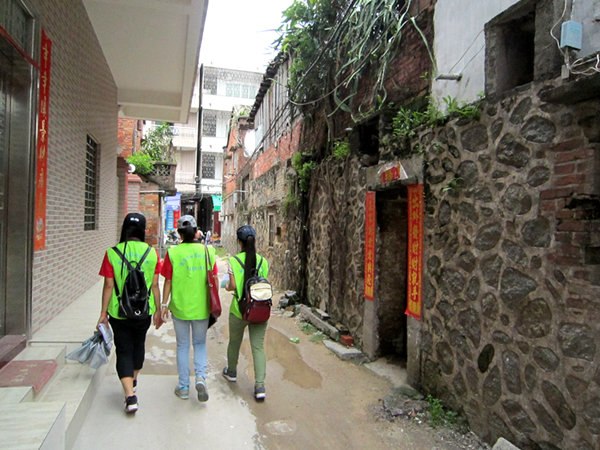 下车沿着电城钟鼓楼的方向直走,组员们一路分发调查问卷,一路询问路人对电城抗日历史的了解程度,及是否熟悉哪位有抗战经历的老人。为得到更多更准确的信息,组员们不惜头顶炎炎烈日,在街巷中来回穿梭,不时走进民居、店铺与当地人深入沟通。终于在一家凉茶店遇到了对电城抗日历史颇有了解的蔡先生。