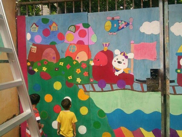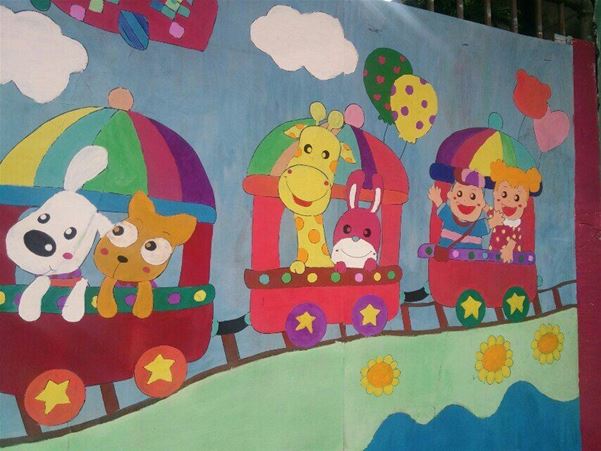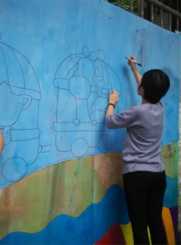 其实,工程最大的就是重新创设幼儿园的一面外墙,从清洗旧画、设计构图、准备各种颜料工具、确定底色、马克笔构轮廓、上色等等,一系列的步骤都是我们从未在墙上尝试过的!刚开始的第一个步骤清洗旧画就已经花了一个上午,过程很辛苦,特别是一些油漆,很难清洗,而且过程也发生意外——大暴雨。曾经有灰心过,但是,我们更多的是选择“坚持,坚持再坚持。”