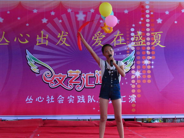 下午三点,附近的村民就已陆续来到汇演地点——杨柑镇中心小学。通过队员与学生的积极准备,汇演于四点正式开始。此次汇演中既有展现大学生风采的表演,也少不了小朋友从大学生身上所学习到的成果展示。由大学生代表带领着小朋友表演的合唱《开学第一课》拉开汇演序幕,引来了观众的阵阵掌声。朗诵诗《梦想起航》中学生字正腔圆,感情饱满;舞蹈《bar,bar,bar》与特色走秀《我的舞台,我的show time》则展现了学生特有的青春与活力;由队员带来的滑轮表演《风火轮》一出场就引来阵阵掌声,将现场气氛推向高潮。本次汇报演出由实践队成员与兴趣课堂同学共同参与演出,旨在检验兴趣课堂的教学成果,增进志愿服务队成员与兴趣课堂学生的友谊。这些节目把队员及学生们青春活力、全面发展的风采表现得淋漓尽致。