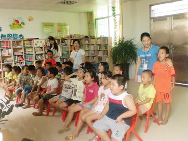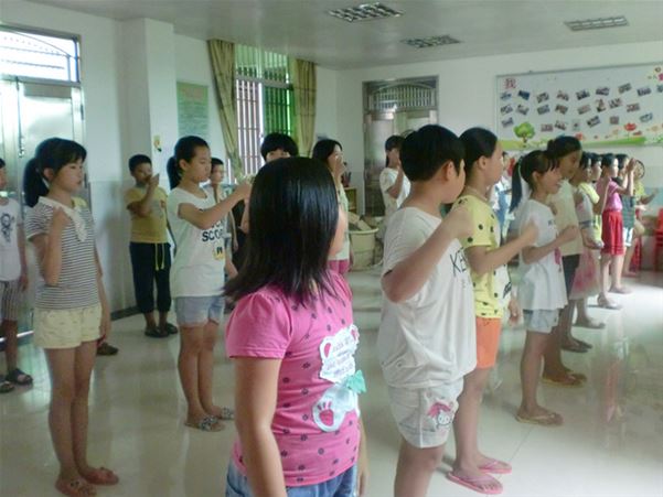 练习完歌曲后,紧接着就是手语彩排。孩子们先跟着社工练习了一遍,把基本的手势动作记熟,然后社工播放音乐,看看孩子们能否抓住节奏,手语动作与歌曲旋律是否一致。随着悠扬的音乐响起,孩子们不慌不忙地举起他们的小手,有模有样地在头顶上空比划着,他们嘴巴微张,嘴里念念有词,一边唱着,一边打手语。虽然节奏方面还跟不上,但手语动作已经熟练,只见他们伴着歌词的变换不断在他们的可爱面孔上演绎着各种各样的角色,安静的乖孩子,活泼的小精灵。每一个表情都体现他们的心情,愉悦欢快的,无忧无虑的。一双双舞动的小手,仿佛在天空恣意飞翔,灵动有力。宁静的夏天是如此美好,而孩子们也用自己指尖上的舞蹈诠释了心中的宁夏。