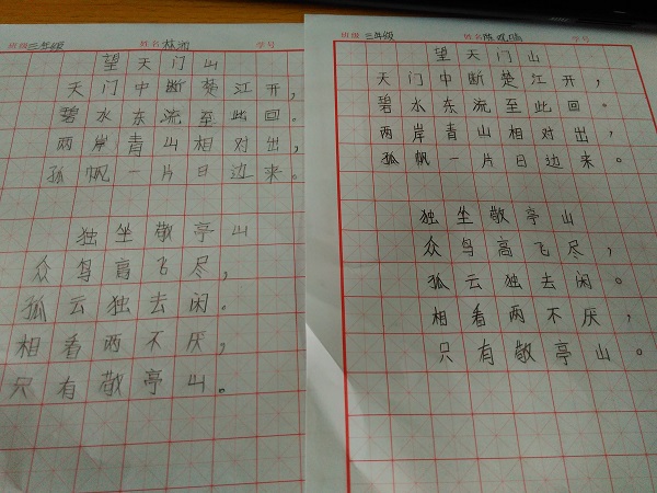 看着黑板上写的歪歪扭扭、左右失衡的名字,我语重心长的说:“同学们,你们自己看看黑板,写得好的同学再接再厉,写得不好的同学不要气馁,要向别人学习;我希望你们在课堂上能认真学习,课间可以尽情玩耍,你们要时刻记住什么时候该做什么事;你们更要明白,‘一分耕耘,一分收获’,只要认真写,就一定可以写得一手好字。”从那以后,书法课堂上,我看到的是学生们练习书法时的认真态度以及明显的进步。