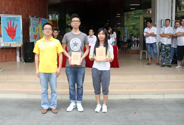 经过老师精彩的点评后,主持人宣布了我校第七届海报设计大赛总决赛的获奖名单。获得专业组一等奖的是选送自校社联的作品,作品运用1904~2014这两个年份以及我校的一些特色景点来表现我校的110周年校庆,“岭南师范学院”几个苍劲有力的字仿佛一块基石落在海报下端。获得非专业组一等奖的是来自生命科学与技术学院的作品。作品采用画着我校特色景点的胶卷绕成“百”字,表现我校在百年中的历史积淀。掌声中,校团委李亚九副书记为获奖同学颁奖,并亲切向他们表示祝贺。最后,嘉宾们和选手们合影留念,为这次海报大赛划上了圆满地句号。