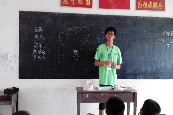 待星光实践队队员邓游蔚向学生们简单的自我介绍后,就开始讲解授课内容。该课的内容共三部分。他先简绘一张中国地图,并介绍采用加分制开展了小组间关于雷州文化的竞赛的规则,借此来吸引同学们的兴趣。“同学们,你们知道到雷州半岛在地图的哪个位置吗?”邓老师是这样问学生们来展开第一部分。学生们用手指出雷州半岛的位置;随后老师详细讲解了雷州半岛的由来及其地理位置。