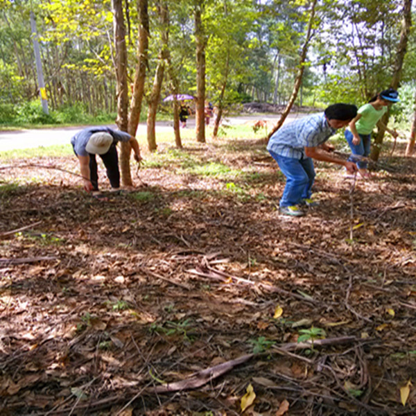 心动不如行动,当天下午两点半晴天队召集十几名队员带好装备冒着炎炎烈日浩浩荡荡地往山里前进。坡边小学地处的唐家镇以种植桉树和甘蔗为主,随处可见的桉树林为队员们捡柴提供了天然“产柴基地”。他们步行没多远便走进了一片桉树林,长十来米长的桉树落下的树枝长年累积在地,队员们见了满心欢喜,一窝蜂似的涌入树林。手脚利落的一下子捡了满满一大堆,平日里较为娇气的尝鲜似的带着几分兴趣也拾了不少。