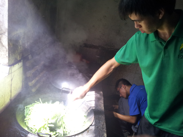 他们说,厨房其实是男人的天地,因为在厨房从早上到晚上,永远会有他们几个后勤男生的背影。砧板前,他手起刀落,无论是肉还是菜都稳稳妥妥地分开一块一块;火炉前,他“尽忠职守”,加柴的同时不忘把稳火的大小;炉灶旁,他手抄菜勺,双手刚劲有力,把四十多人的饭菜一手一手翻炒煮熟……