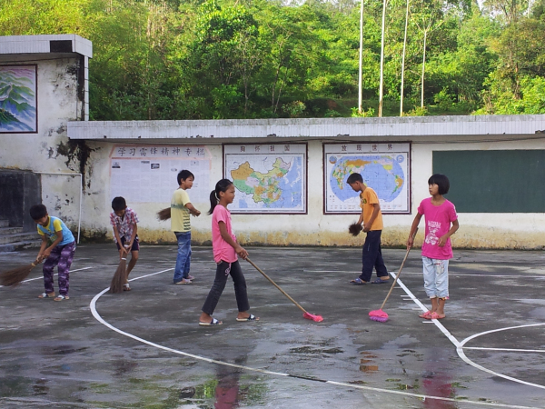 “我们把场地的水清扫一下吧,等会孩子们站的时候不会太湿。”“好。”然后大伙就开始一人一扫把开始清理开班仪式的现场。突然地,场地上多了十多个瘦小的个子,他们用小小的手紧握着扫把,认真而卖力地把垃圾扫在一起,把水扫开。他们无声地加入,无声地干活,使大家惊讶之余,还有满满的感动。此时阳光恰好从云层走出来,照在这一群大孩子和一群小孩子身上,温暖和谐。