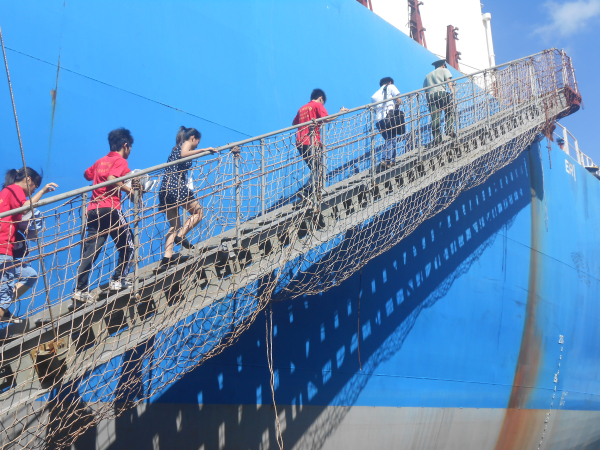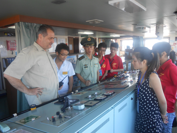 在该轮管理人员的陪同下,几分钟时间,学子们如愿以偿地登上了希腊大货轮。头顶是蓝蓝的天空,脚底确实是深不可测的海洋。在轮船上,登轮人员有受到了船长的热情招待。在轮船贵宾厅,学子们尝到了国外不同风味的饮食,也了解到船长的一番远洋经历。
