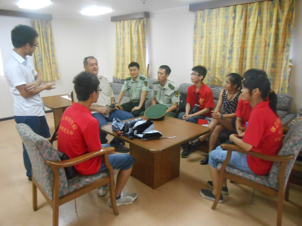 船长对湛江师范学院的大学生们,能利用暑期的时间下乡支教、了解社会和服务群众的做法,表示肯定和赞扬,队员们也佩服船长的毅力和意志,把一生都献给自己珍爱的航海事业。接着,在船长的带领下,中国边检人员和湛江师范学院的这些支教大学生们,兴致勃勃地参观了大货轮,以及听取了船长对货轮和机组的详细介绍。