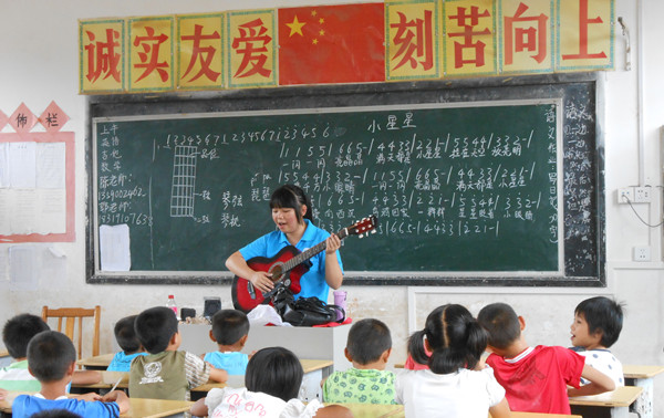 在支教期间,生动有趣的第二课堂深受学生的青睐。与传统教学方式不同,队员采用教学合一、形式多样的教学方法,让学生在快乐中学习,课堂上一片欢声笑语。其中吉他课最能吸引学生的注意,课堂上,队员抱着吉他,边给学生讲解乐理知识,边用吉他演示。随后队员给学生弹唱了一首筷子兄弟的《父亲》,给学生讲了父亲节的由来和父爱的伟大,并教导他们孝敬父母,理解父母的辛苦,好好学习,将来回报父母。教室里一片寂静,学生们在下面听得津津有味,有的学生眼里还泛着泪花。这里三面环山,经济并不发达,大部分学生都是留守儿童,父母均在外省工作,一年只能见一两次面,只留下年迈的爷爷奶奶在家照顾他们。