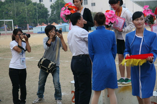 是他们,手拿相机,穿梭在人群中的摄影记者们,在各个比赛场地旁边,他们时刻留意着、等待着,准备着,摄下那娴熟的跳跃,那矫健的奔跑,那沉稳的面孔。看,他们时而蹲下、时而侧身,只为拍下运动员们最美的一刻,纵身跳跃,划出美丽的弧线;奋力直追,印出坚定步伐;一张张定格的画面,是最宝贵的珍藏,最感人的回忆。