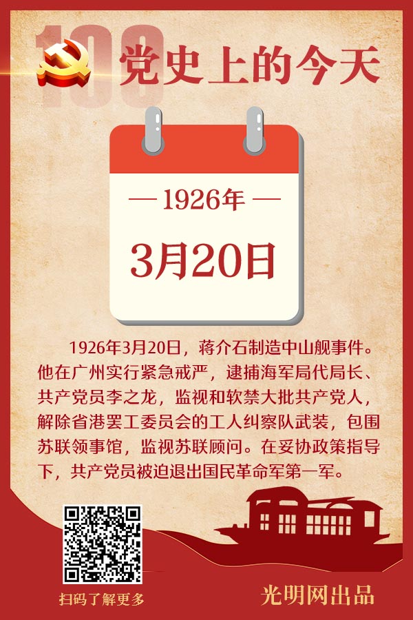 3月20日蒋介石制造中山舰事件。他在广州实行紧急戒严,逮捕海军局代局长、共产党员李之龙,监视和软禁大批共产党人,解除省港罢工委员会的工人纠察队的武装,包围苏联领事馆,监视苏联顾问。当时在广东的国民革命军六个军中,有五个军的军长同蒋介石存在着矛盾。在蒋介石直接指挥的第一军中,政治骨干大部分都是共产党员。毛泽东等分析了当时的形势,主张以叶挺独立团为主,发动工农群众,联合国民党左派和一切可能联合的力量,给蒋介石以坚决回击。但共产国际代表主张退让。在妥协政策指导下,中共中央接受蒋介石的无理要求,共产党员被迫退出第一军。毛泽东、周恩来建议把这批共产党员派到其他军中去,建立叶挺独立团式的革命军队,中共中央没有接受这一主张。蒋介石通过中山舰事件,不仅打击了中国共产党,而且打击了汪精卫和国民党左派,大大加强了他在政治上、军事上的地位。