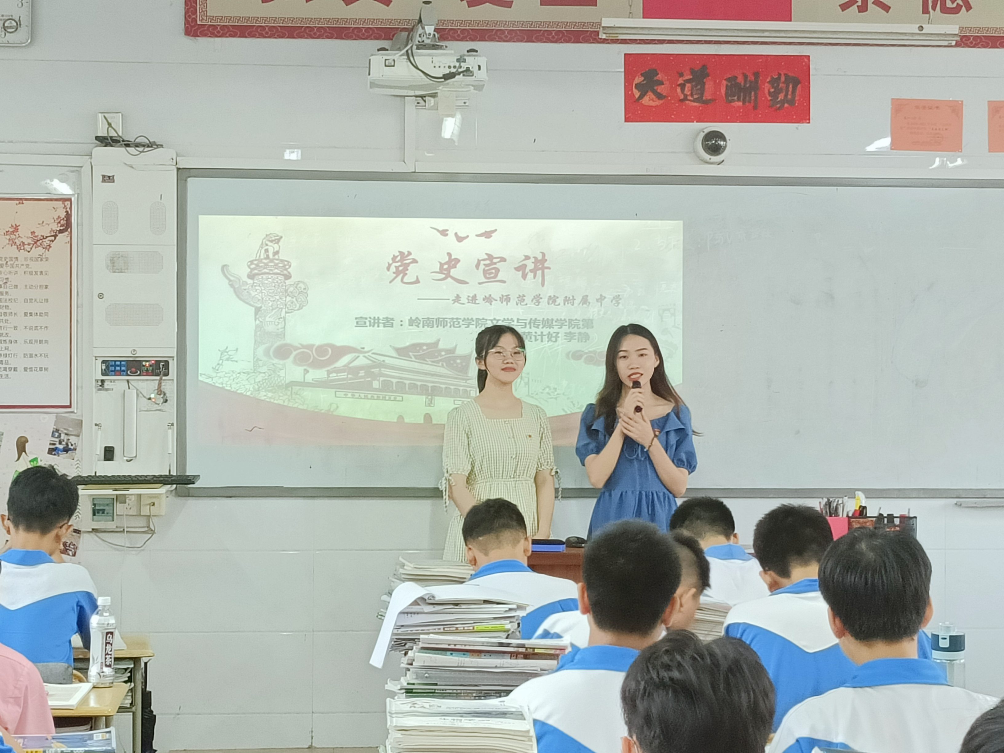 5月15日,为深入贯彻习近平总书记在党史学习教育动员大会上的重要讲话精神,文学与传媒学院组建了学生党员党史宣讲团走进岭南师范附属中学,把党史学习教育带进中学课堂,以生动的课程形式激发学生们对党史学习的热情,引导学生学史明理,学会感恩,坚定对党的理想信念。