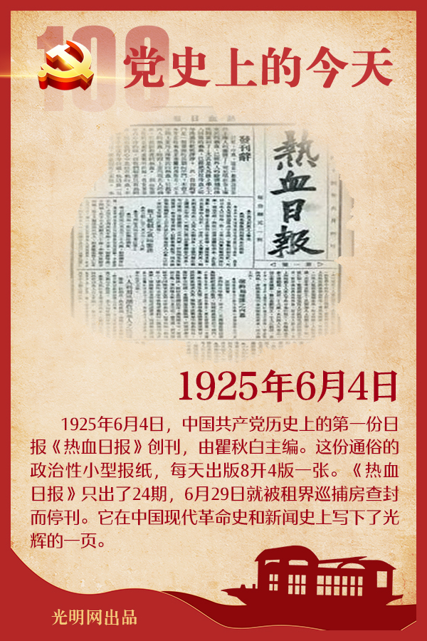 6月4日 中国共产党历史上的第一份日报《热血日报》创刊,由瞿秋白主编。这份通俗的政治性小型报纸,每天出版8开4版一张。《热血日报》在密切配合政治斗争、及时宣传报道上海和全国各地反帝反封建的群众爱国运动,坚持正确舆论导向和战斗性的同时,还注重文章的通俗性、群众性和形式的多样性,让一般的工人和市民群众都能看懂。《热血日报》只出了24期,6月29日就被租界巡捕房查封而停刊。它在中国现代革命史和新闻史上写下了光辉的一页。