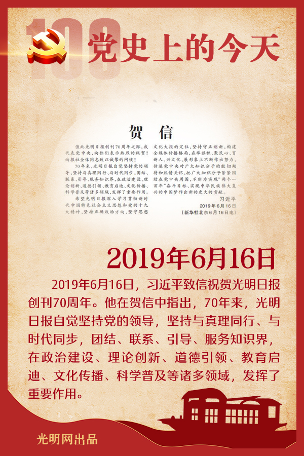 习近平致信祝贺光明日报创刊70周年。他在贺信中指出,希望光明日报深入学习贯彻习近平新时代中国特色社会主义思想和党的十九大精神,坚持正确政治方向,坚守思想文化大报的定位,坚持守正创新,构建全媒体传播格局,在举旗帜、聚民心、育新人、兴文化、展形象上不断作出努力,传递党中央对广大知识分子的殷切期待和热情关怀,把广大知识分子紧紧团结在党中央周围,不断为实现“两个一百年”奋斗目标、实现中华民族伟大复兴的中国梦作出新的更大的贡献。