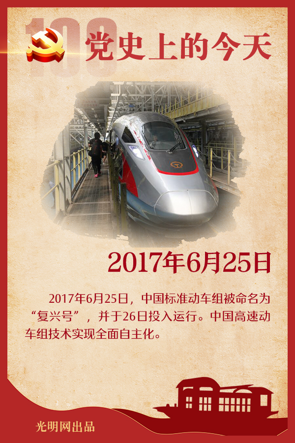 6月25日 中国标准动车组被命名为“复兴号”,并于26日投入运行。中国高速动车组技术实现全面自主化。