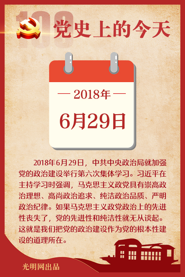 6月29日 习近平在主持中共中央政治局第六次集体学习时讲话指出,党的政治建设是党的根本性建设,要把党的政治建设摆在首位,以党的政治建设为统领。