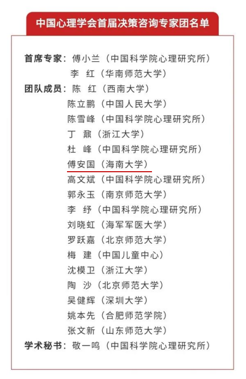 近日,中国心理学会在中国科协的指导下成立了决策咨询专家团队,经学会各专业委员会推荐,学会执委会评审确认及遴选,团队由来自社会心理服务、应急管理、职业心理健康、心理危机干预、发展与教育、情绪心理、心理应激、心理韧性、智能人机交互、管理决策等多个领域的19位专家组成,我校2006届心理学专业毕业校友,现任海南大学管理学院教授的傅安国作为专家入选。