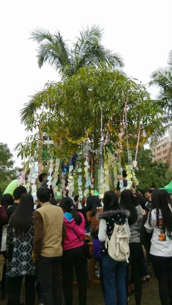 开完会回来体育馆前人依旧很多,但表演已经结束了。愿望树前有很多人,书上挂着满满的心愿,便利贴贴在绳子上,吊在树上,随风飞扬,甚是好看。看着她们在写心愿,听朋友说愿望树上的心愿真的会实现的,我也很想写上一个,但是有点不好意思,还是放弃了。