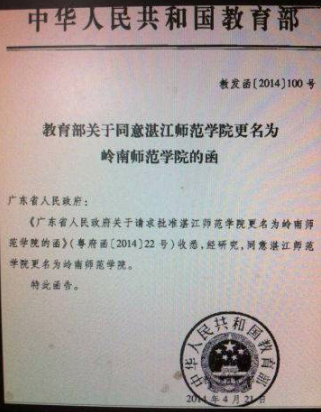 当我看到教育部的批文,此函中明确写道:2014年4月21日,教育部同意湛江师范学院更名为岭南师范学院。于是我就果断地写上了‘我们在岭师等你’!