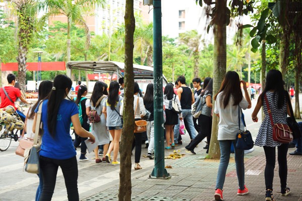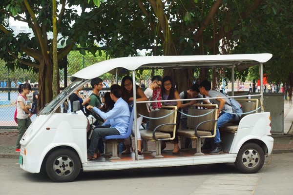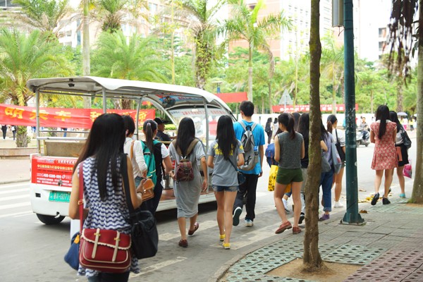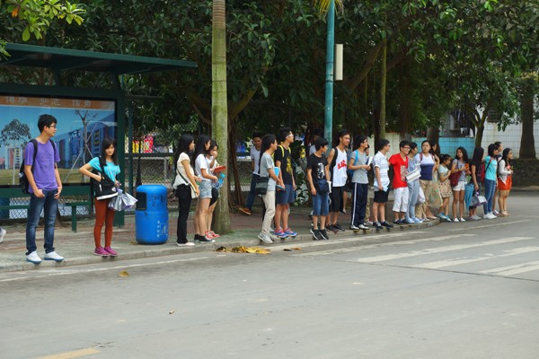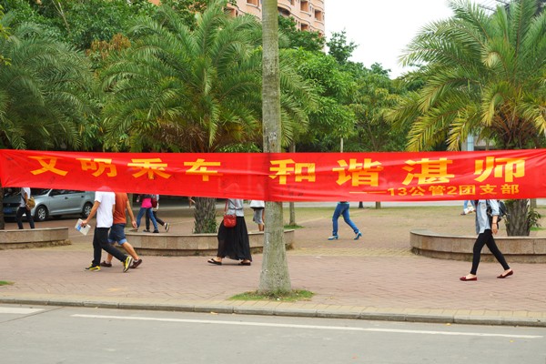 说到湛师,我觉得最让人难忘的是湛师的校车。不是因为它有多么的特别,而是因为要是能坐上校车,那就是件十分幸福的事情了。原因何在?校车难等是一回事,最大的原因是湛师人的问题。好不容易等来一趟校车,结果呢?蜂拥而上的人群早已把校车挤得满满当当,哪里还有你的位置?有人说,难道湛师坐校车不排队?恭喜你答对了,挤校车,是湛师人的一门必修课。对比于同在湛江的海大,海大的校车站旁边,学生们自觉的排成一条队,有秩序的坐校车。而反观湛师,校车站形容虚设,校车站上的乘车要求更是被无视了千百遍,挂在校车站旁边的横幅就更显的讽刺。