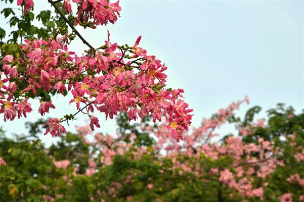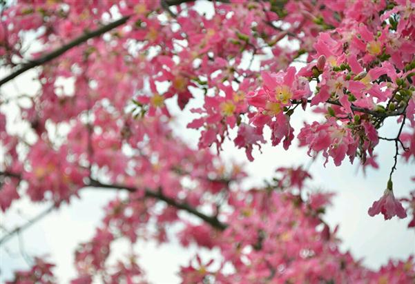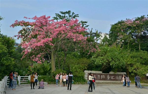 于是乎,就开始了忘我的构思、移步、调焦、控光、按快门……这时手机不停地响起,公务电话接连不断……就在我倚在围栏边左手接电话,右手拿相机,两眼盯着美人花时,一群路经此地的女学生也发出了连连的惊呼,纷纷激动地跑到美人树下,加入了自拍和互拍的行列,摆着各种各样的姿势,一时间好不热闹啊!谁说美人之间只存嫉妒恨的?!美人也是会惺惺相惜的!!!