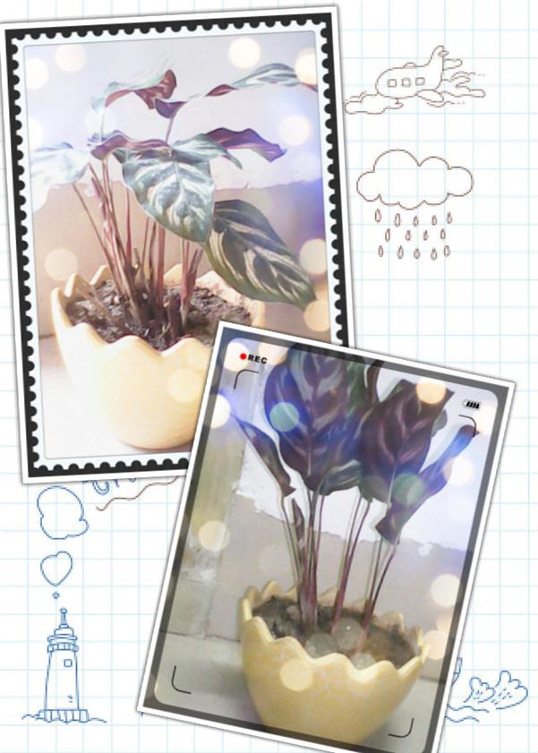 这盆种的植物叫孔雀竹芋,我在这里放了两张照片,其实是想通过对比,让大家感受一下植物昼夜的形态变化。 左上角这张是白天拍的,其叶片是展开的;而右下角是夜晚拍的,其叶片是收缩起来的,现在,大家应该看出一点区别了,这两张照片形象地同我们展现了它在昼夜期间不一样的生理反应喔!
