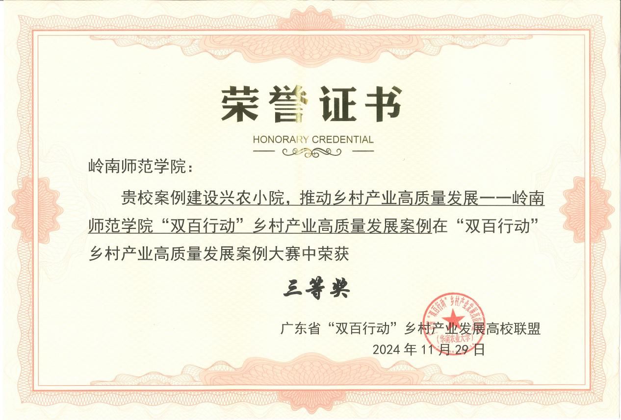 为持续优化农业科技创新生态,引导农业科技创新赋能“百千万工程”典型产业高质量发展,探索“科技-市场-产业”良性发展机制,营造农业发展新质生产力的良好环境,助力实现高水平农业科技自立自强,乡村产业高效联盟组织开展了“双百行动”乡村产业高质量发展案例大赛。大赛一共有28个单位推荐了56个案例,评选出31个获奖案例。其中,由生科院党委书记李发武、生科院院长刘锴栋、学校校地合作办主任钟召春联合撰写的《建设兴农小院,推动乡村产业高质量发展——岭南师范学院“双百行动”乡村产业高质量发展案例》荣获三等奖。