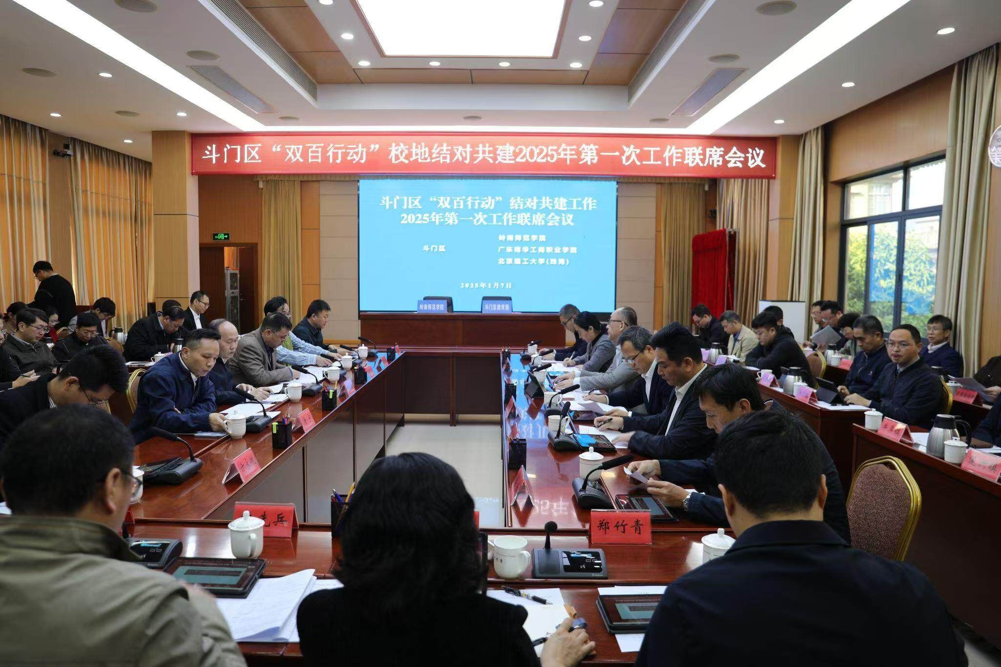 斗门区“双百行动”结对共建工作2025年第一次工作联席会议上,校地双方听取了斗门区“双百行动”工作服务队2024年工作推进情况,并举行了“教师发展共同体”“科技成果转化”框架协议签约仪式和“百千万工程突击队工作站”揭牌仪式。