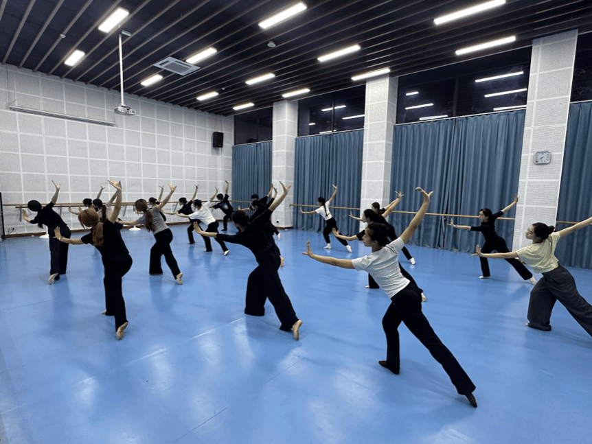 在创作和教学推进中,团队坚持“理论先行、实践赋能”,从文化内涵到动作逻辑层层深入,先懂“舞之魂”、再练“舞之形”,让学子在学练展中收获双重成长。朱培科为展演学生解读湛江麻章“考兵将”傩舞的祈福民俗与动作背后的故事,拆解《男儿当自强》的精神力量与舞蹈节奏,结合教材图谱把专业理论转化为易懂知识点;搭建多轮展示,组织学子分组展演、同台竞技。从克服紧张情绪大胆登台,到精准把控动作细节与团队配合,学子们在反复排练与展示中不断突破自我,在实践中深化了对美育教育的认知。