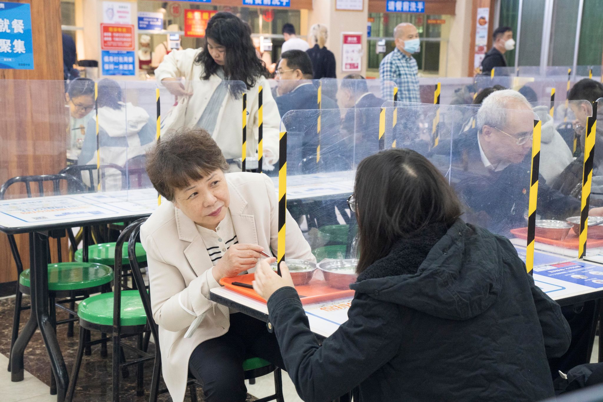 学校党委书记兰艳泽与学生边用餐、边交谈