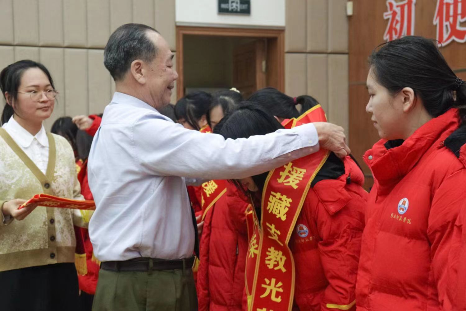 学校1989届校友、曾任西藏自治区林芝市墨脱县委书记的陈观如为支教队员授荣誉绶带。