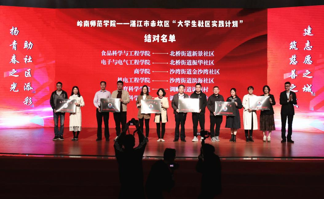 在岭师音乐厅的启动仪式现场,首批遴选的赤坎区8个街道18个村(社区),与岭南师院18个二级学院结对共建。岭师党委副书记黄达海、团湛江市委书记谭凌、赤坎区委副书记韩伟雄依次向结对的村(社区)和学院颁发了“大学生社区实践服务站”牌匾。