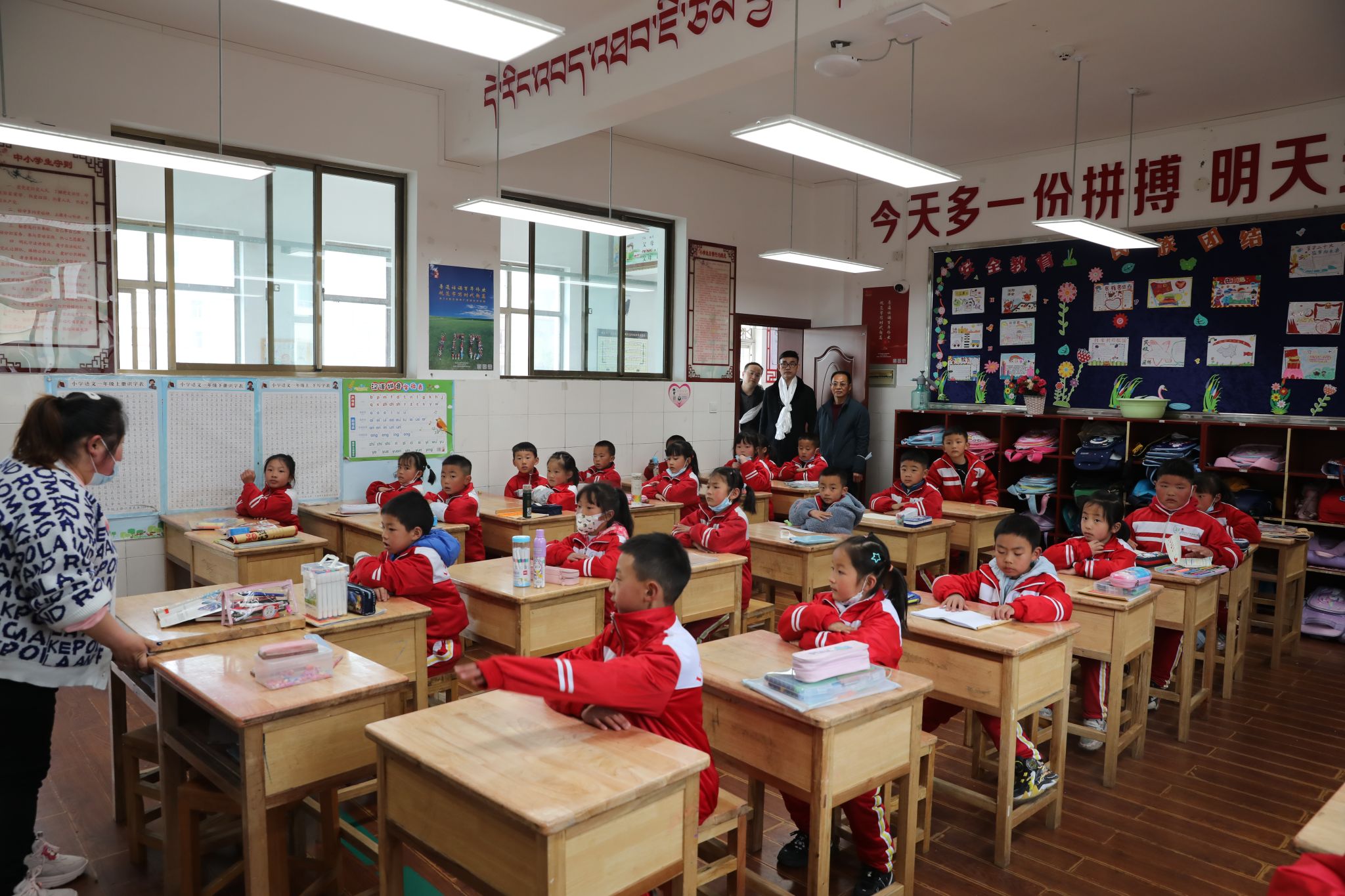 在工布江达县巴河镇中心小学看望援藏志愿者张妍和蔡锦潮同学