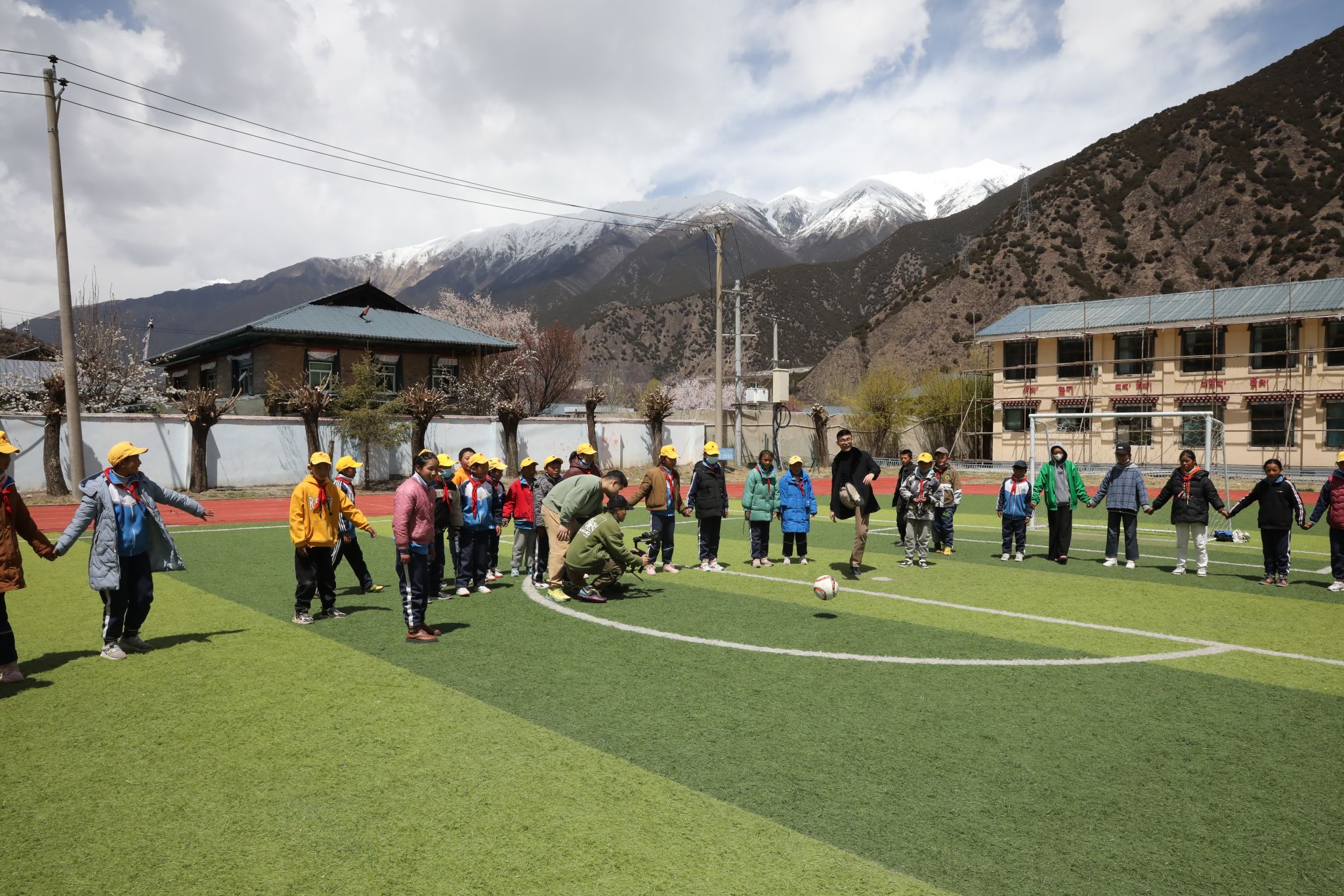 在工布江达县仲莎乡中心小学,黄达海一行看望了美术学院郑丹妮等三位援藏支教学子的生活、住宿情况,看到郑丹妮在学校教学楼二楼的墙绘画时,叮嘱她最好现场教学边画边教学生如何画,将教学成果留在学生的心里和记忆里。了解到该校的体育课很有特色,看到足球场仍有学生运动时,黄达海走进孩子们中间一起踢足球,孩子们的欢笑声飘荡在雪域高原上空。