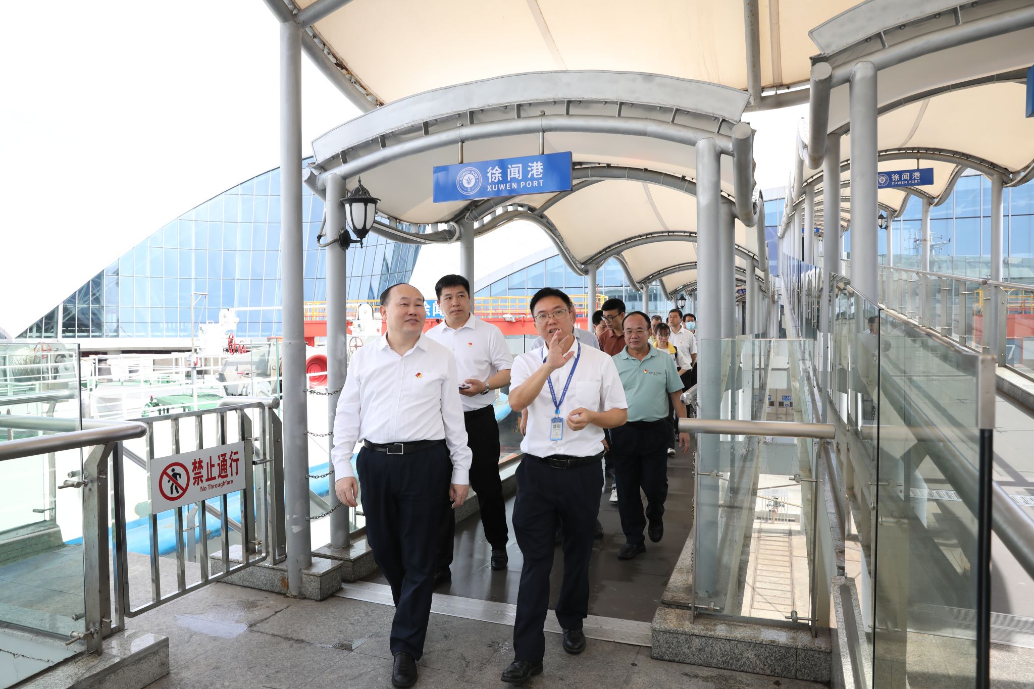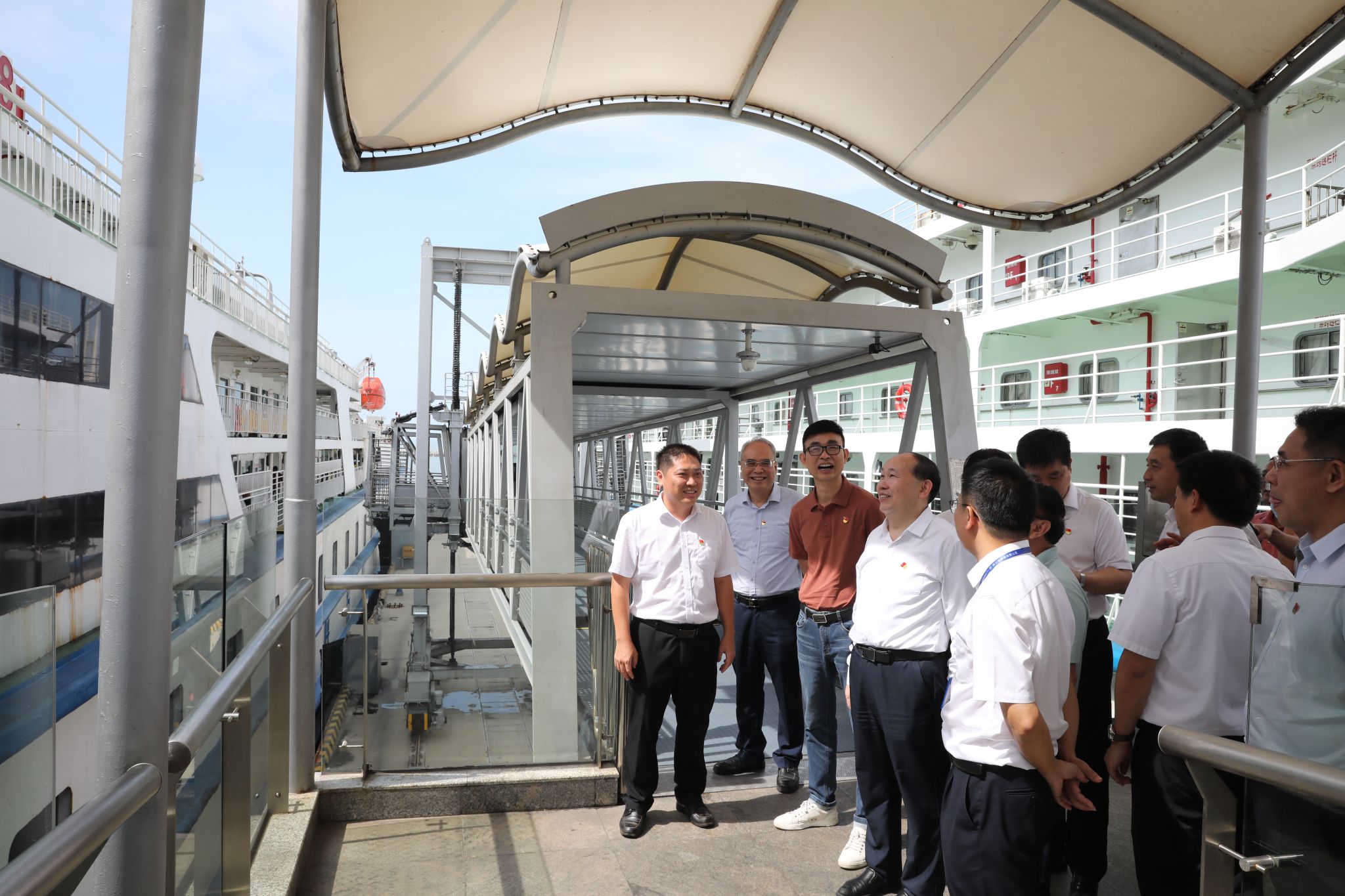 “琼州海峡是国家经略南海的战略通道,也是海南自由贸易港建设和发展的咽喉要道。”登上栈道,碧海蓝天,港口的海风徐徐吹来,一艘艘庞大的货运船舶停泊在岸,货物装卸紧张忙碌。在徐闻港泊位码头,工作人员向大家介绍广东省提升交通基础设施互联互通水平、对接海南自由贸易港建设相向发展等方面的情况。