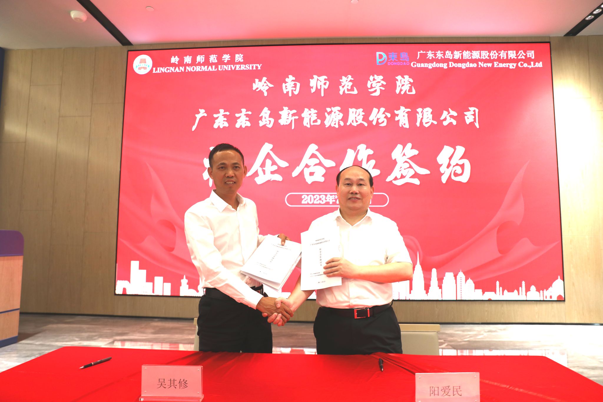 当日,岭南师范学院与广东东岛新能源股份有限公司(简称东岛公司)校企合作签约仪式在东岛公司一楼报告厅举行。岭南师范学院校长阳爱民、广东东岛新能源股份有限公司董事长吴其修在双方合作协议上签字后,迈向主席台和校企专家教授一起,共同为“校企合作产学研协同育人项目——智能制造东岛创新人才班”“岭南师范学院产学研基地”“岭南师范学院专业实习基地”揭牌。