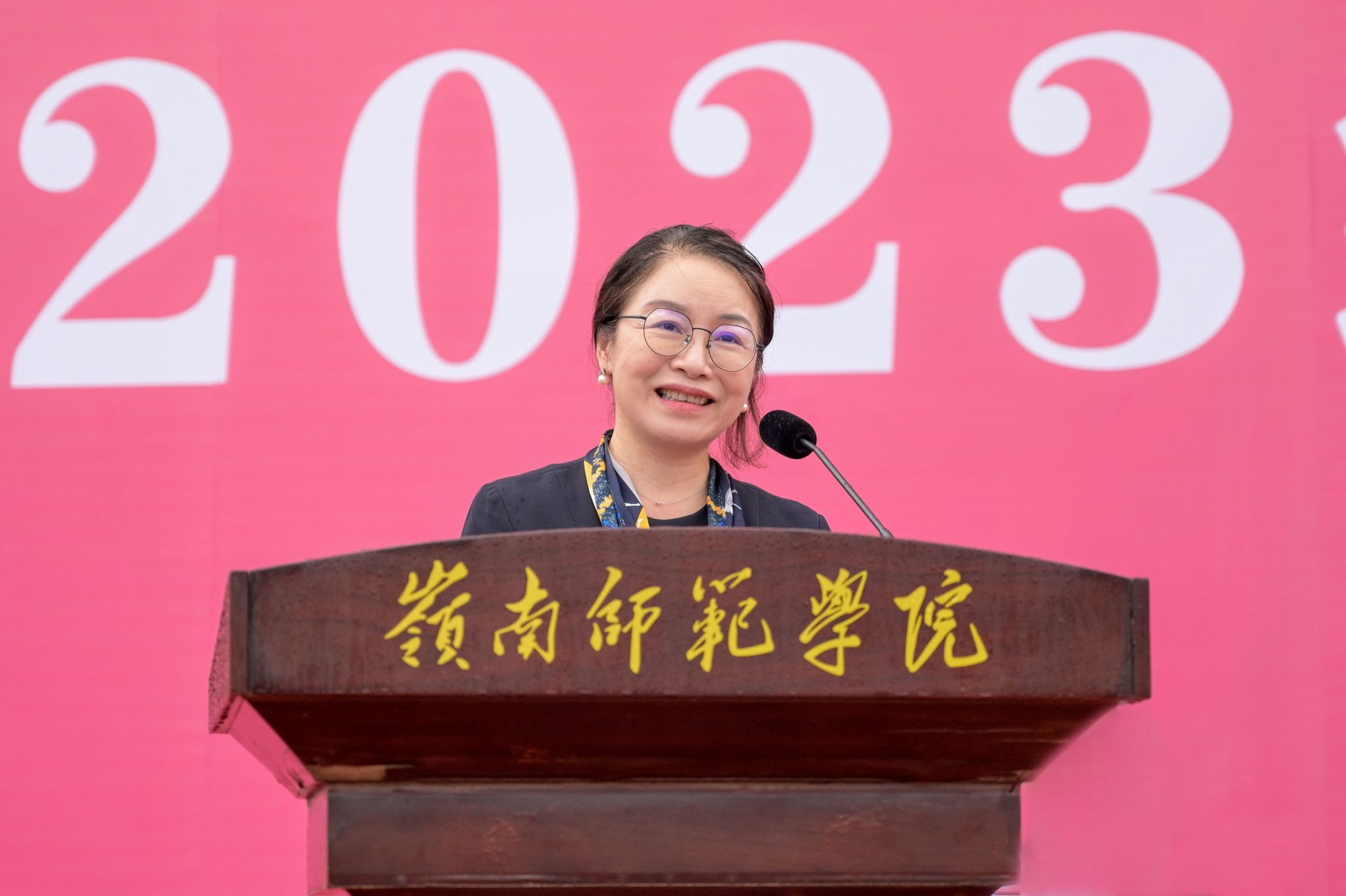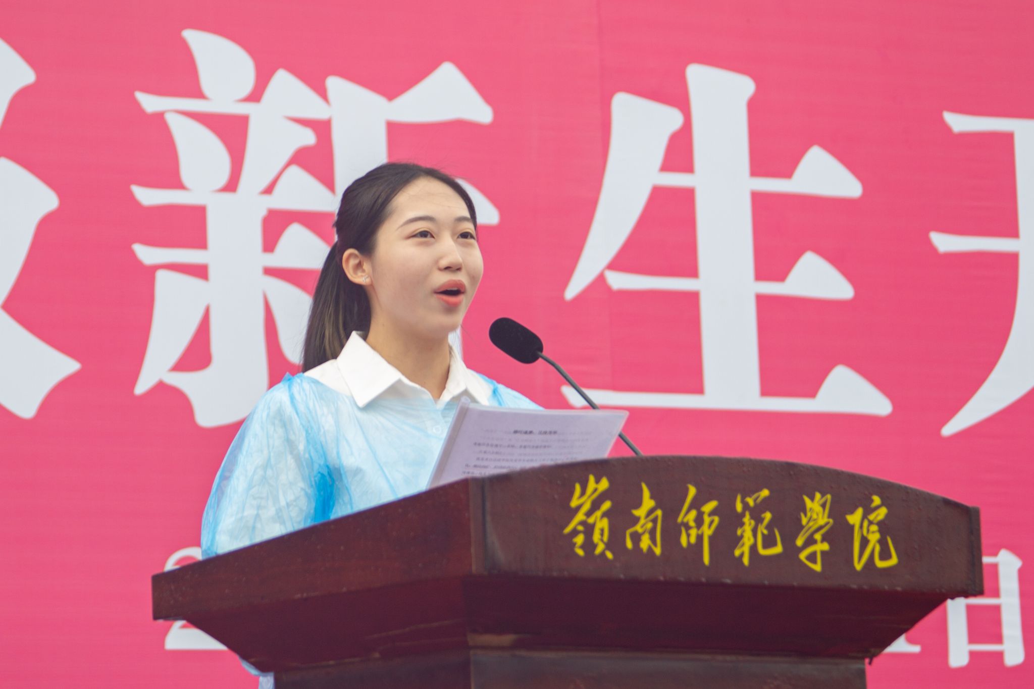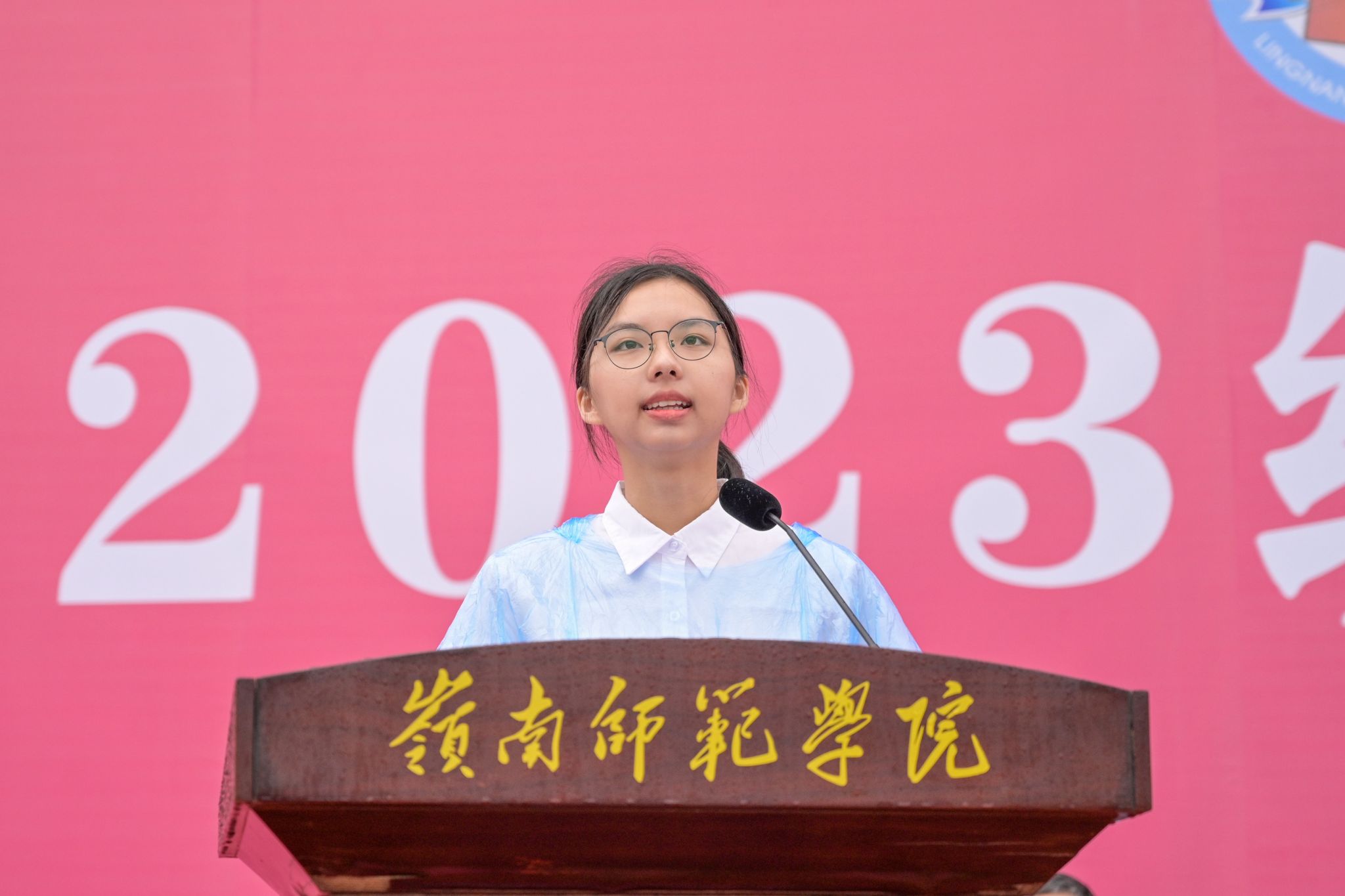 文学与传媒学院2023 级汉语言文学专业的舒涵作为新生代表发言,分享了她成为岭师人的自豪,并与新生共勉做一名做有情怀、有光亮、有边量的岭师人。