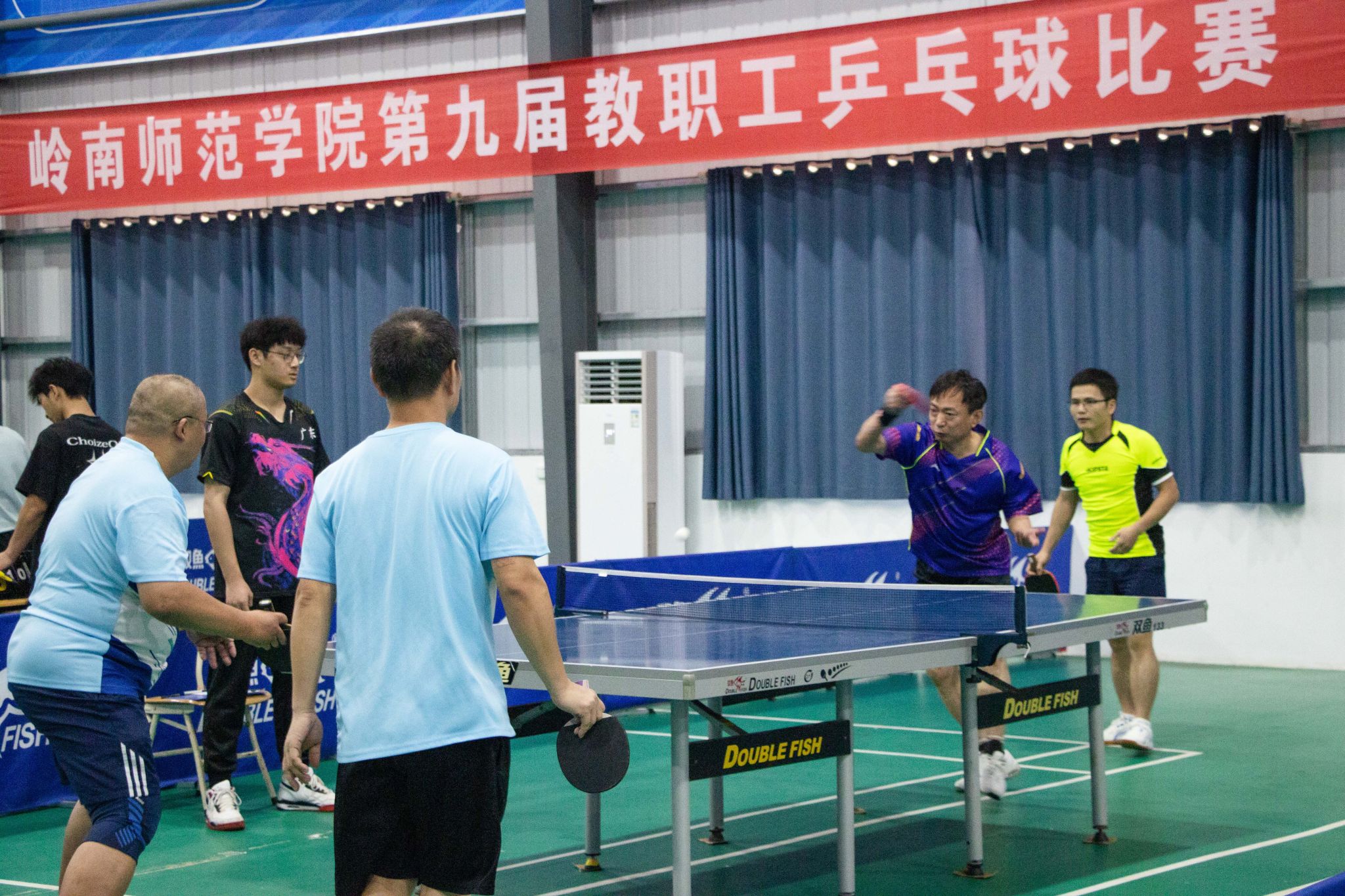 岭师新闻中心讯:5月17日至19日,由校工会主办、体育科学学院承办的岭南师范学院第九届教职工乒乓球比赛在乒乓球馆举行。来自24个代表队200多名教职工参加比赛。学校党委书记兰艳泽,副校长苏古发,华师帮扶工作队队长卢勃,党委常委、组织部部长赫云鹏分别代表所在机关代表队参加比赛。