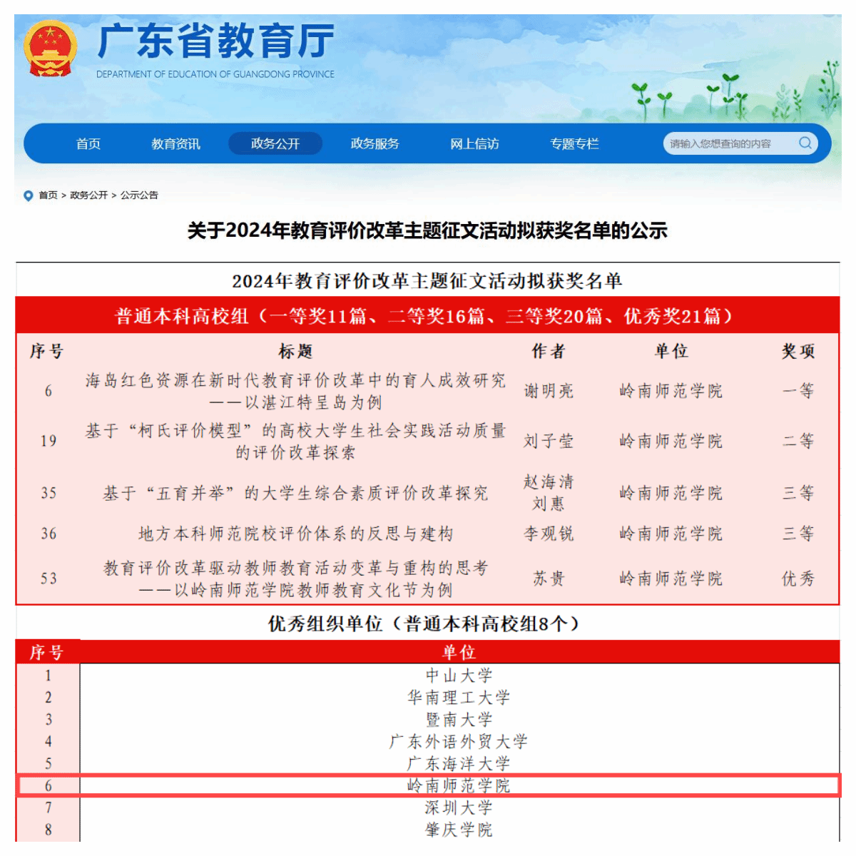 据悉,《广东省教育厅关于开展2024年教育评价改革主题征文活动的通知》下发后,学校领导高度重视、精心谋划、扎实部署,深化新时代教育评价改革工作领导小组办公室(设在规划与法规处)面向全校教职工征集教育评价改革的好经验和好做法,组织校内外专家匿名评审征文,遴选、打磨优秀作品上报省教育厅参评,进一步展示了学校教育评价改革的成果。