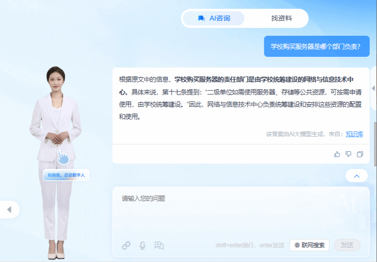 1、精准校园服务:深度整合学校最新规章制度、图书资料、办公电话等本地化数据,可即时解答教务流程、后勤服务、活动申请等高频问题。回答可精准溯源来源文件。