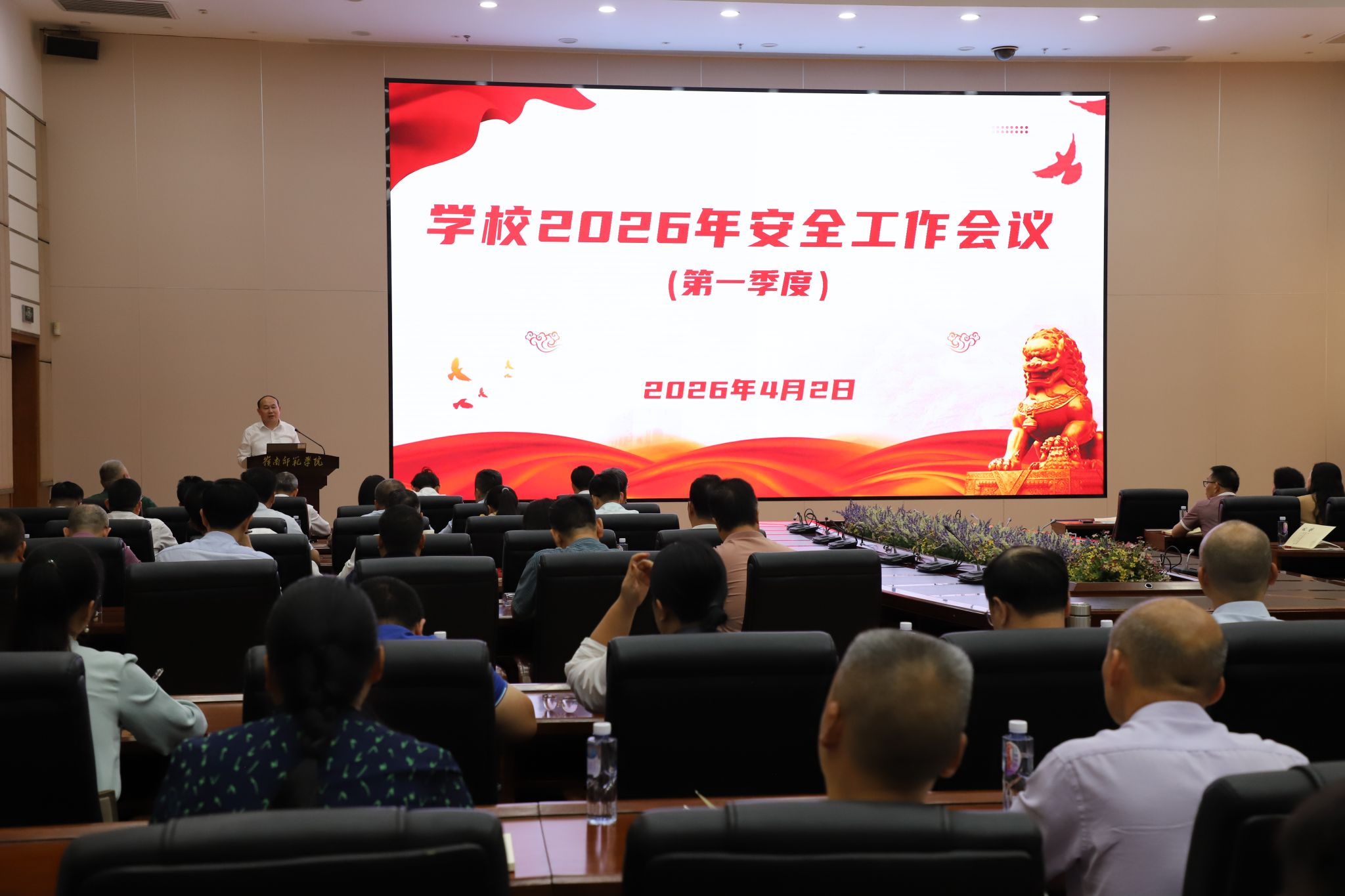岭师新闻中心讯:4月2日,学校在国际会议厅召开2026年第一季度安全工作会议。会议全面复盘第一季度学校安全工作情况,深入剖析典型事件教训,部署第二季度重点任务。学校党委书记阳爱民出席会议并讲话。副校长刘坤章主持会议。