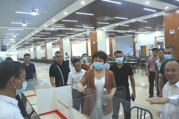 兰艳泽校长率队在鸿园餐厅安全检查时对餐桌隔离板进行现场检查指导(赵宇清 摄)