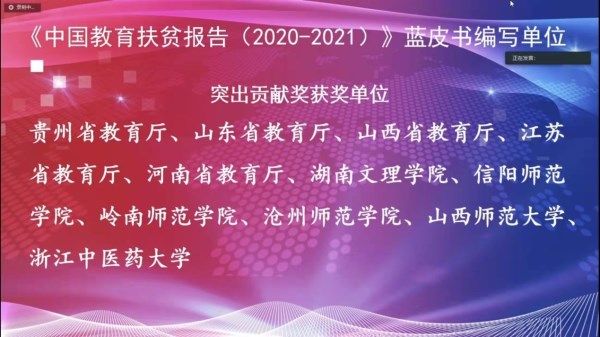 发布会上宣读了《中国教育扶贫报告(2020-2021)》蓝皮书编写单位获奖名单。我校作为参编单位,优质高效完成编撰任务,荣获“突出贡献奖”。中国乡村教育研究发展中心助理主任龚东卫对《中国教育发展与乡村振兴报告(2022)》新版蓝皮书的工作部署作了简要说明,北京师范大学教育学部部长朱旭东教授对会议作了学术点评和总结。