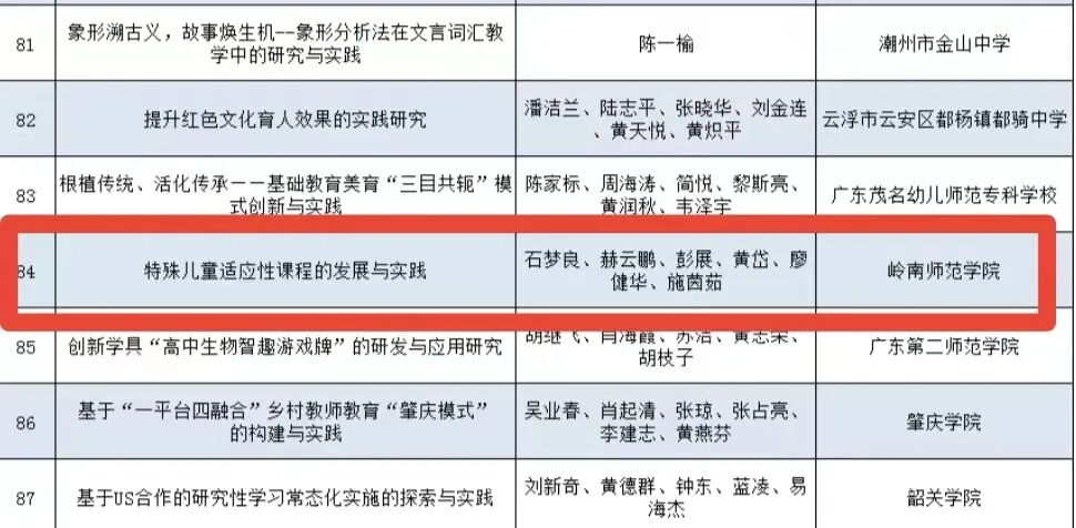 经推荐、评议、公示、省教育厅审定,由吴涛、陈永恒、高秀娥、桑海涛、彭增焰、洪伟铭、吴东、闵笛团队完成的《新工科导向的地方高校计算机类专业人才培养机制创新与实践》项目获高等教育类一等奖。兰艳泽、金义富、周立群、尹宁伟、黄桦、李斌辉、邓倩文、张子石团队完成的《“一本两代三全四得五育”高质量新师范人才培养体系的岭师实践》项目和许抄军、刘海英、沈炜、王松波、刘长军、赵改玲、孟毅、陈智崧、朱琪、梁宇卫、周剑熙、钟足峰、王亚新团队完成的《新商科“1+3+N”实践教学体系构建与实施》项目获高等教育类二等奖。石梦良、赫云鹏、彭展、黄岱、廖健华、施茵茹团队完成的《特殊儿童适应性课程的发展与实践》项目获基础教育类二等奖。