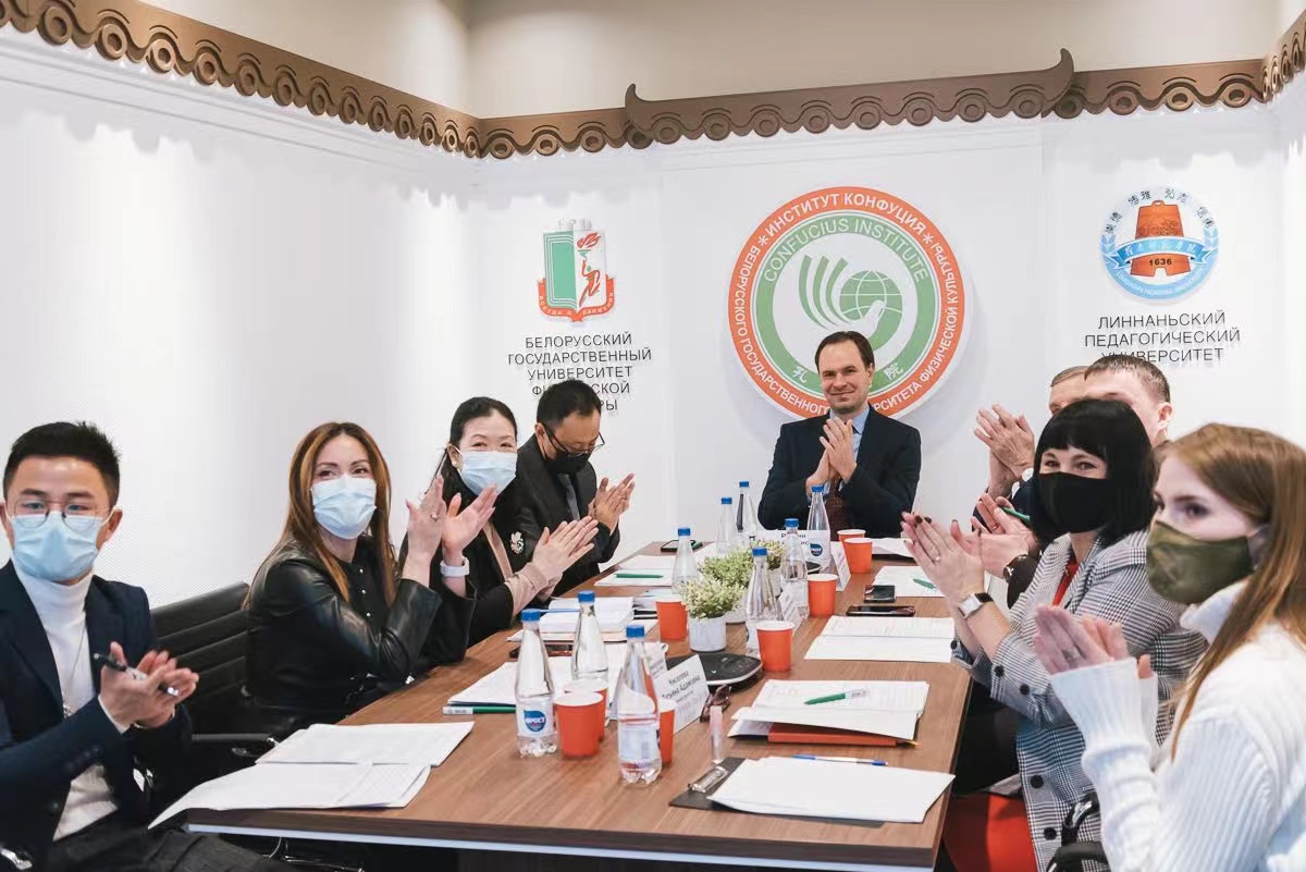 “青山一道同风雨,明月何曾是两乡。”兰艳泽指出,孔子学院面临着国家汉办(孔子学院总部)改制和新冠疫情两大挑战,两校要积极调整角色定位,健全孔院管理体制,完善工作沟通渠道,夯实两校合作基础,进一步加强沟通合作;要继续守望相助,共度时艰,在保证孔院师生安全、稳定教学秩序的基础上,创新孔院的管理、教学及活动模式,在危机中育新机。兰艳泽表示,希望通过两校的精诚合作,共同推进孔院发展,助力中白教育交流合作,增进中白友好情谊,促进中白对话共鉴。