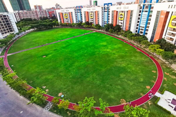 学校新建的树人广场绿色跑道鸟瞰图(毛紫柔 摄)