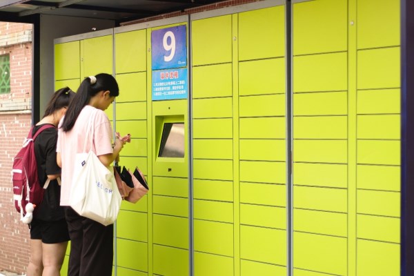 学生正在新设的快递柜前取件(毛紫柔 摄)
