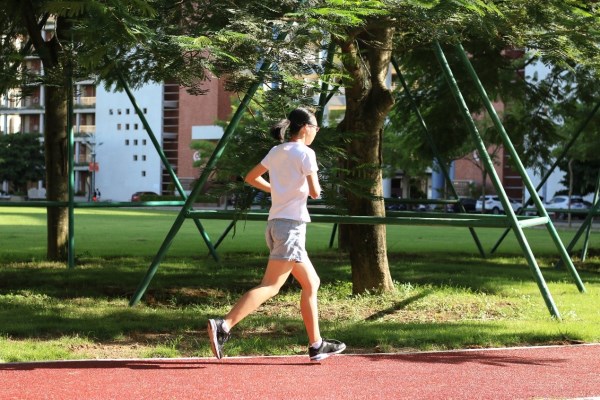 学生在树人广场绿色跑道上跑步健身(廖雯诗 摄)