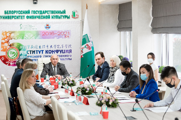 白俄罗斯国立体育大学孔子课堂成立于2015年11月,并于2019年12月升格为孔子学院,两校原计划于2020年举办的白俄罗斯国立体育大学孔子学院揭牌仪式受新冠肺炎疫情影响而取消。值此五周年庆典之际,白俄罗斯国立体育大学孔子学院在此纪念盛典上同时举行了揭牌仪式,维切斯拉夫•杜尔诺夫第一副部长与希尔盖·列普金校长为孔子学院正式揭牌。