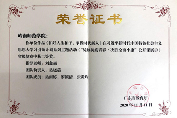 我校法政学院教授刘鑫淼指导的作品《扣好人生扣子 争做时代新人》获大学生讲思政课公开课作品省级复赛二等奖。该公开课通过讲述90后青年的战“疫”故事,让大学生感受抗疫“逆行者”的崇高精神和青春风采,激发情感认同和道德追求,唤起青年大学生的责任与担当。